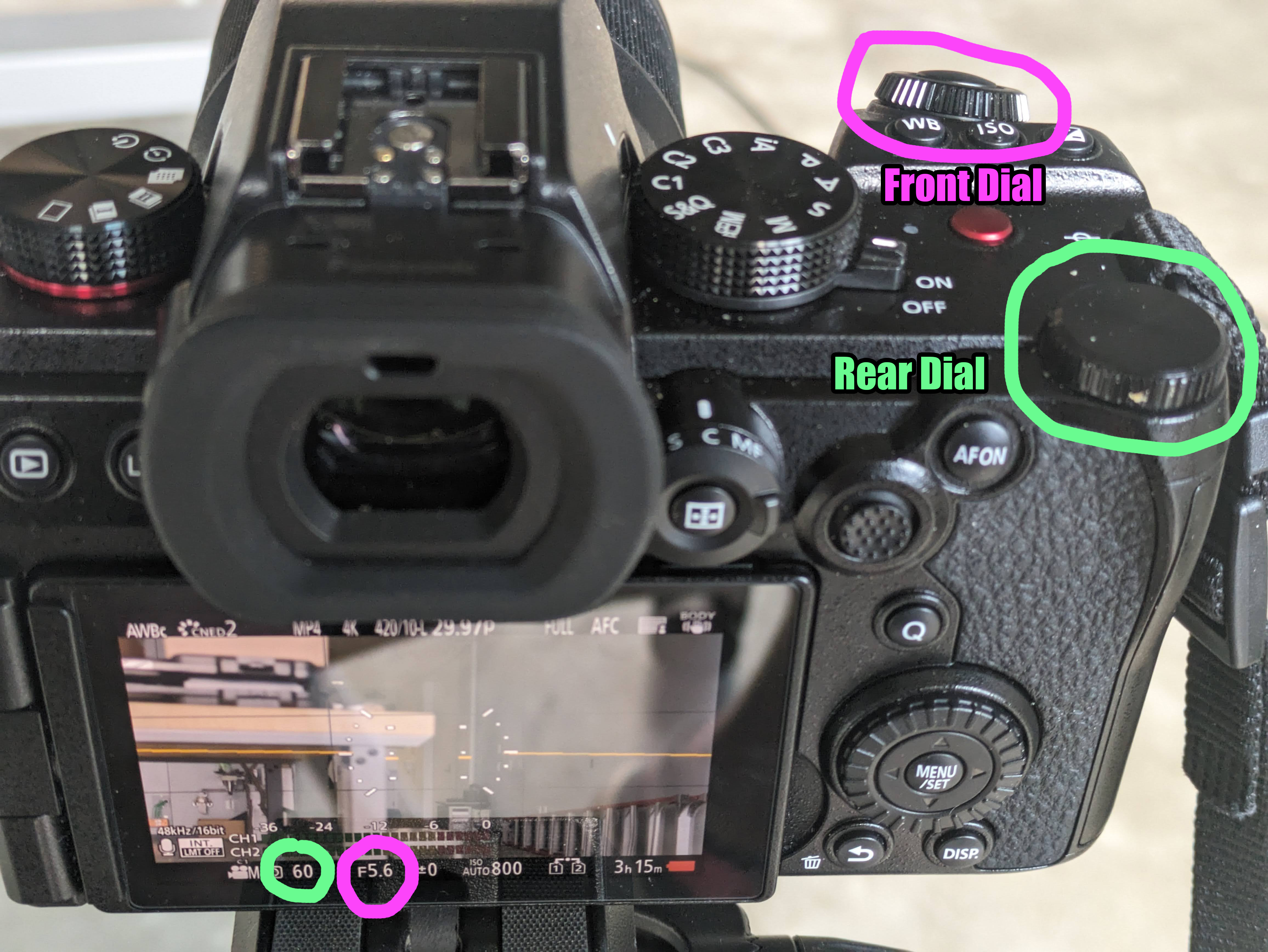<figure><img src="https://1313564241-files.gitbook.io/~/files/v0/b/gitbook-x-prod.appspot.com/o/spaces%2Fs3fEUGujmVHeZsdShSEN%2Fuploads%2FhntvtYj1cJKqB2ivhEEP%2FShutter%20and%20Aperture%20Dials.jpg?alt=media&#x26;token=411eabe6-ea01-454a-8433-8f74b960cba6" alt=""><figcaption><p>Front dial (purple) sets Aperture and Rear dial (green) sets Shutter.</p></figcaption></figure>