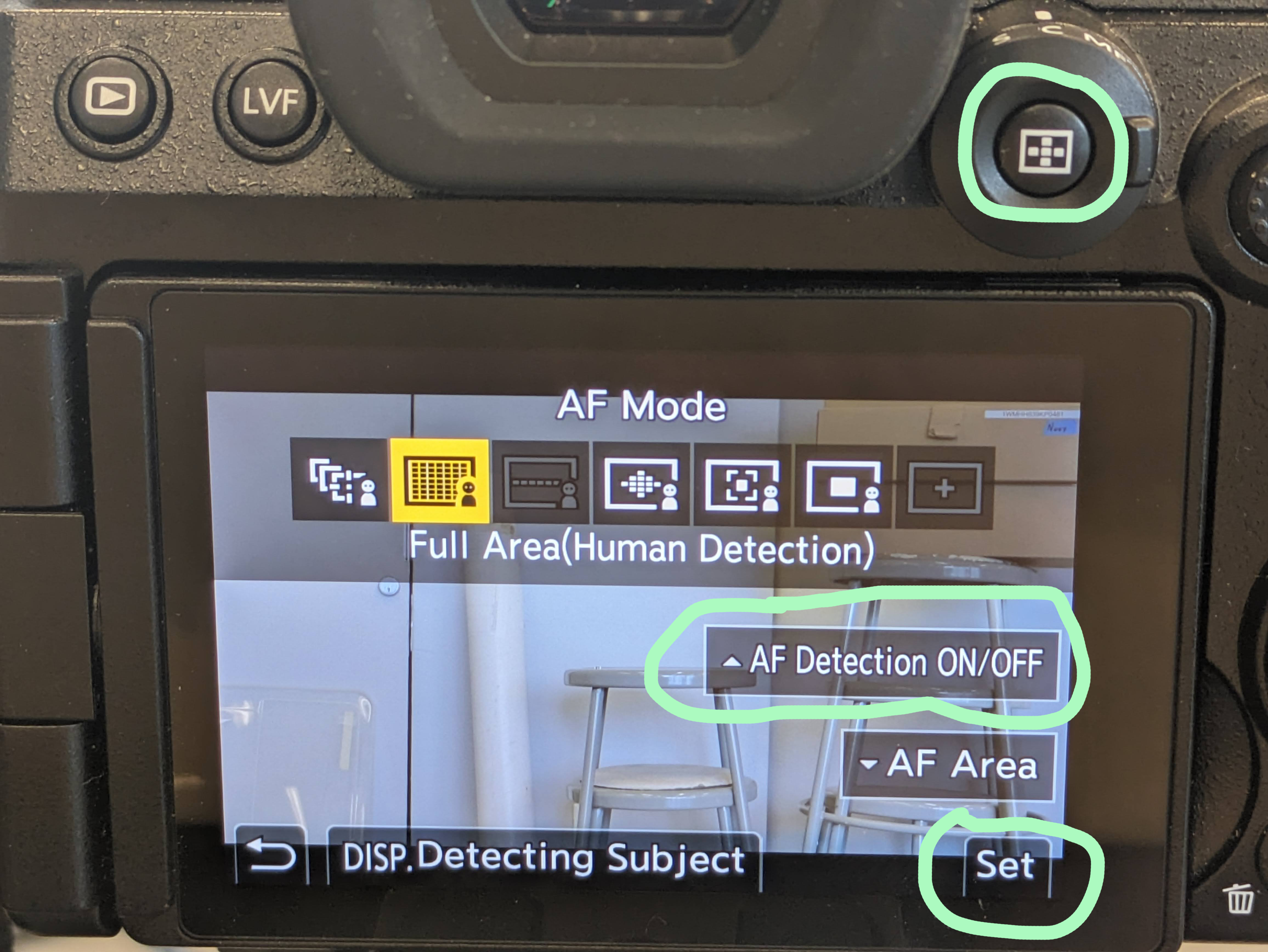 1. ***If*** you don't see "Human" as an option for any AF type, then toggle it on by pressing the "AF Detection On/Off" button on the LCD screen