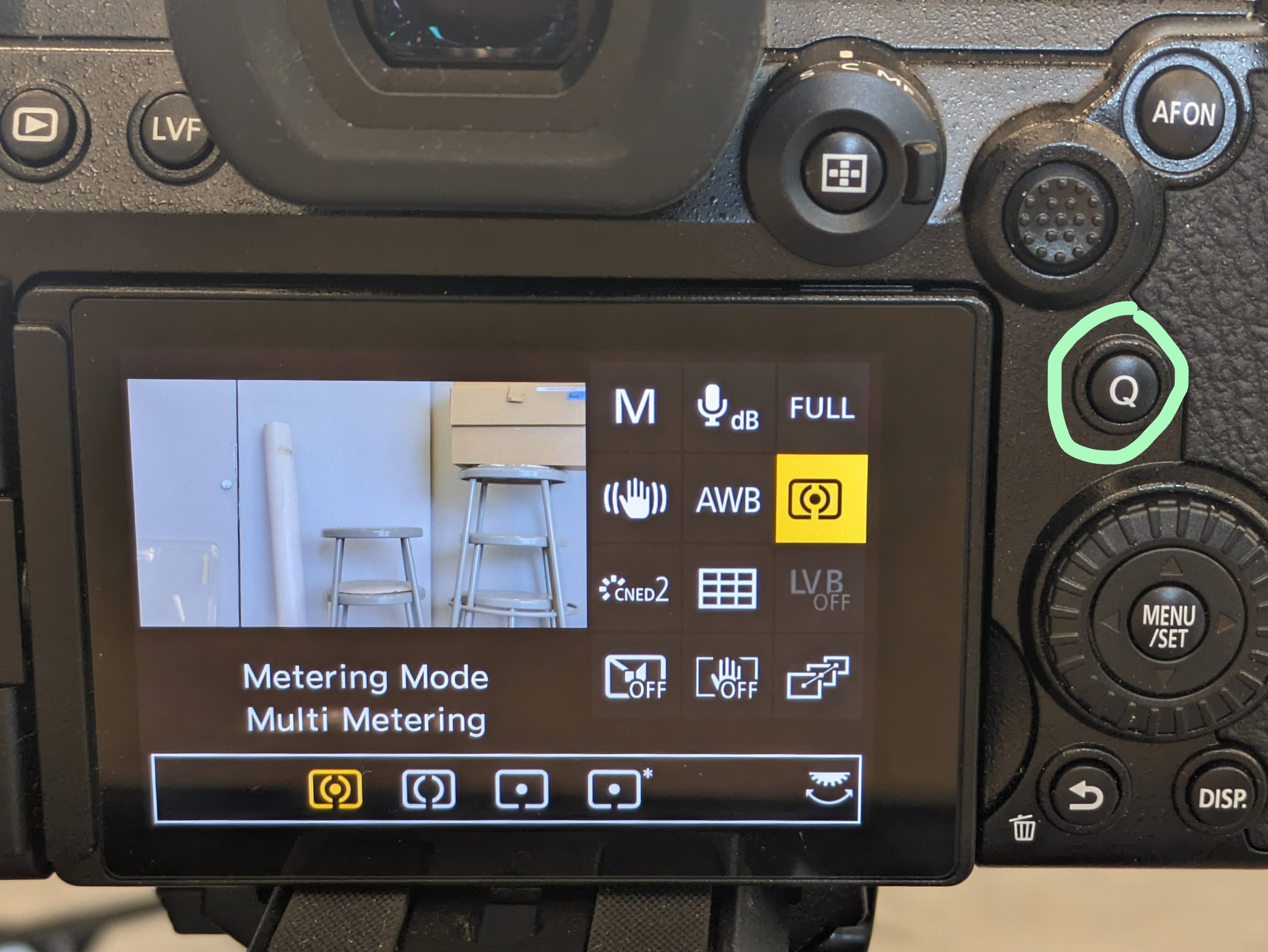 1. Enter the quick menu by pressing the small button labeled "Q" on the back panel of the camera.