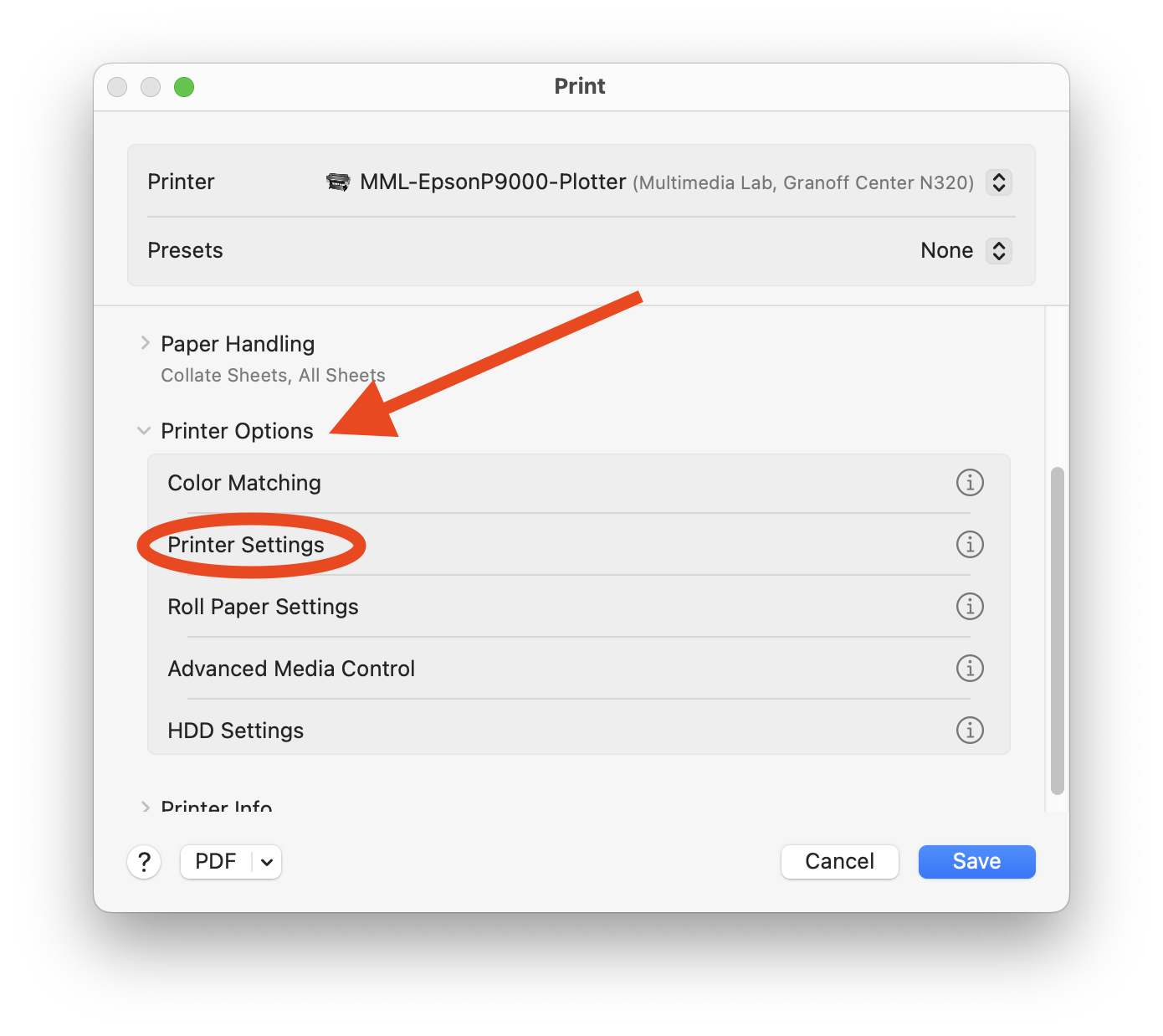 Scroll down and click on **Printer Options.** Then choose ***Printer Settings***.
