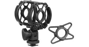 A shock mount screws to the top of the Boom Pole or slides into the mic "shoe". ontop of the camera, and has an adjustable nob to change the axis of the microphone.&#x20;