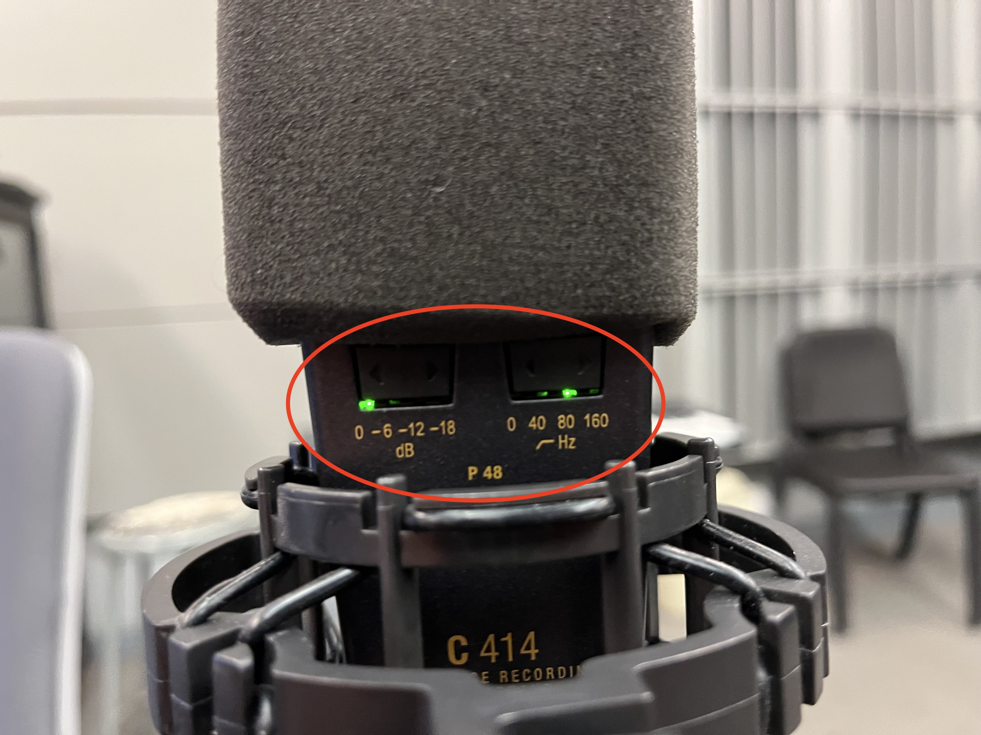 14. On the backs of the microphones, set the *dB* to 0 and the *Hz High Pass* to 80.