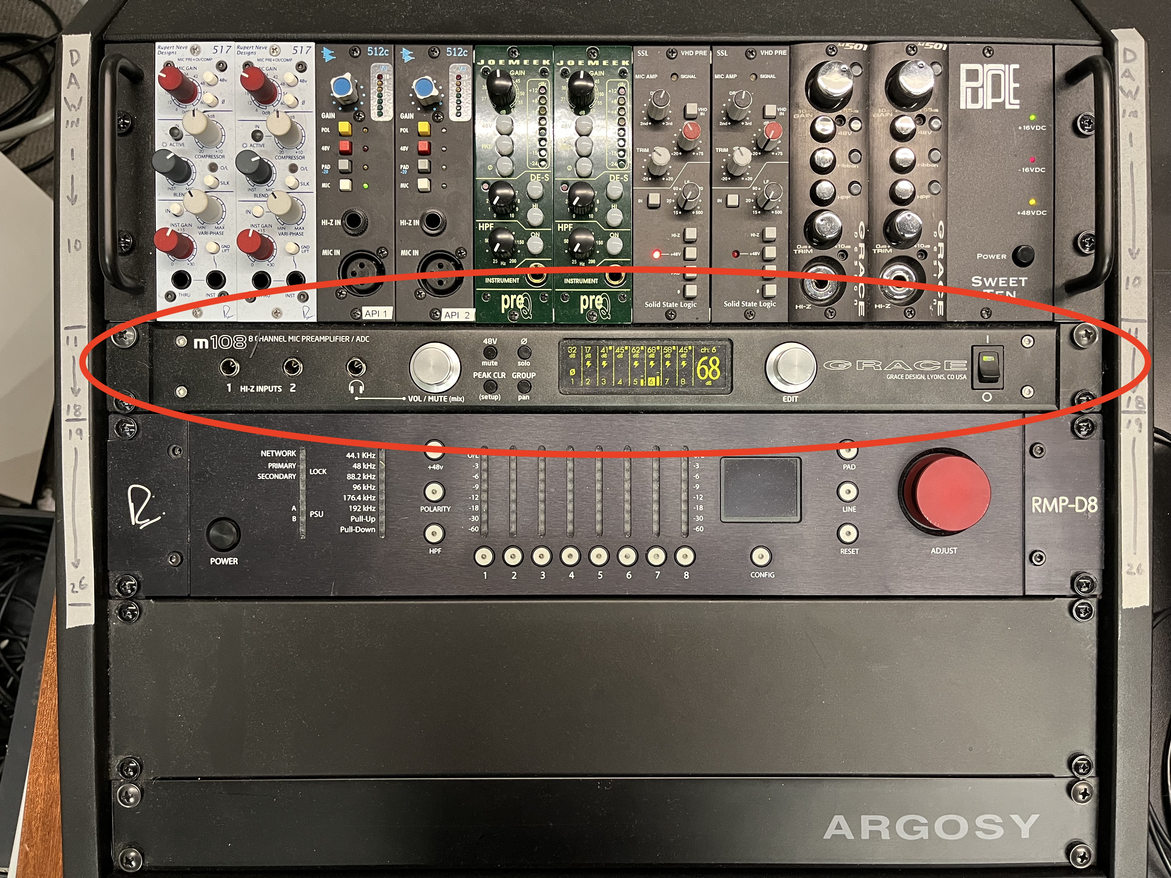 12. Because the **C414 AKGs** are *Condenser* Microphones, we need to make sure that they are receiving *Phantom Power*. This is done on the **m108 Preamplifier.**