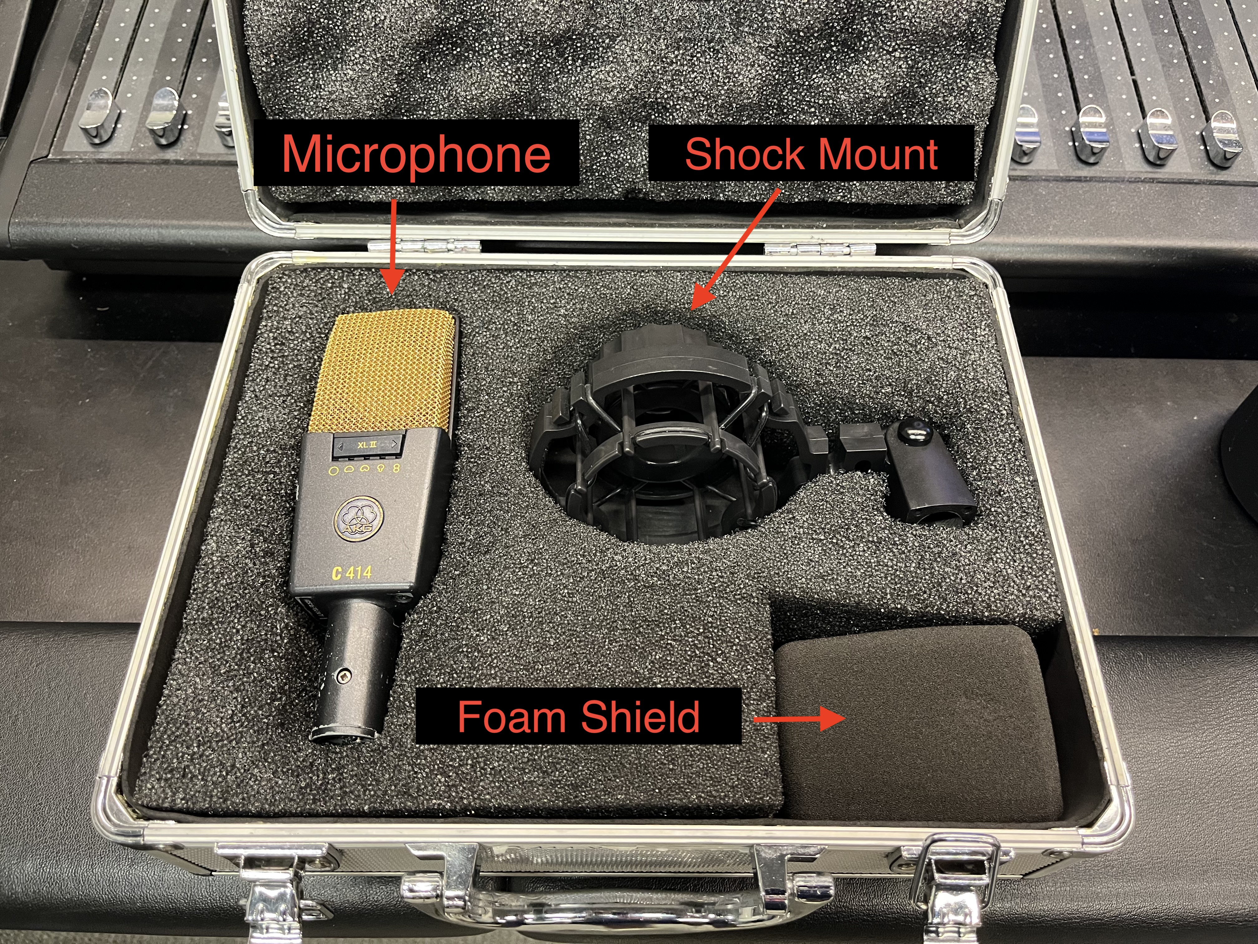 3. Inside each case you will find a **C414 Microphone**, **Shock-mount**, and **Foam Shield**.