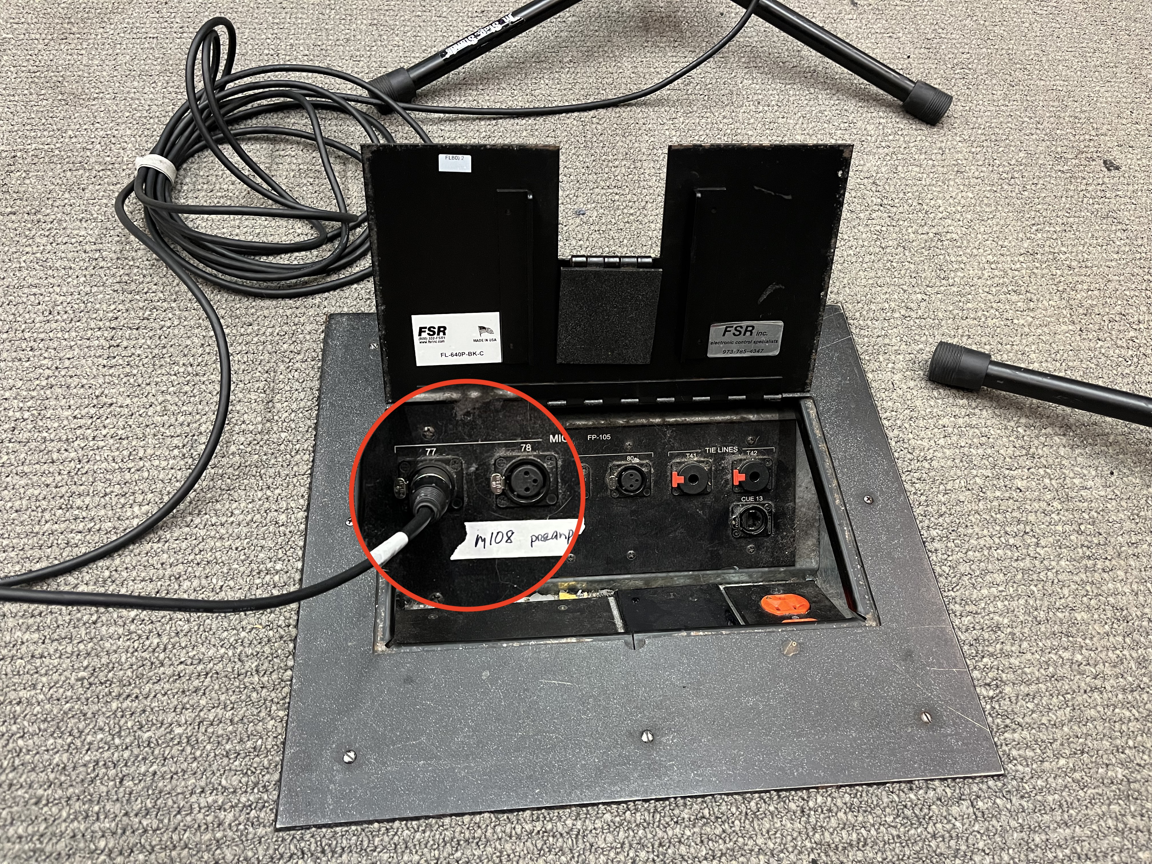 11. Plug the convex ends of both **XLR cables** into inputs 77 and 78 in the floor receiver.